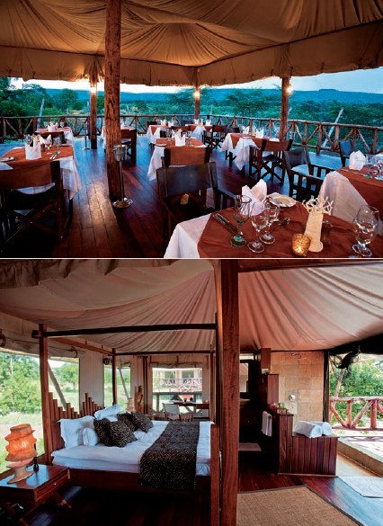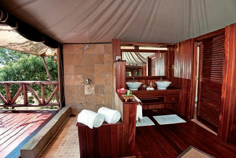 20間奢華帳篷搭在高架木制平臺上,并且有獨立的私人觀景臺,可以經??吹较窈玉R一樣的野生動物。每間房都有一張特大四柱床,以及舒適床墊和亞麻細布。套間內的設施包括太陽能熱水、冷水系統、大浴室、手洗臉盆和獨立洗手間。在一些帳篷里還有坐浴盆和按摩浴缸。